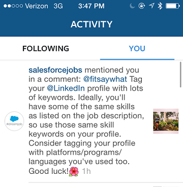 In an article on Inc., contributor J.T. O’Donnell experimented what the candidate experience can be like with some of the top 20 companies to work for in 2015. She picked five companies and went to each of their Instagram pages, liked a few of their pictures, and then commented on one, all using the same text “I love your company and would like to work for you. Do you have any tips for how I can stand out in the application process?”. Then she got an almost instant reply from Salesforce giving her advice.