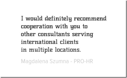 PRO-HR is based in Poland, Warsaw and runs recruitment processes for clients across Europe and Russia. My clients are mid-size fast growing companies from different industries e.g. logistic solutions, transport, FMCG.